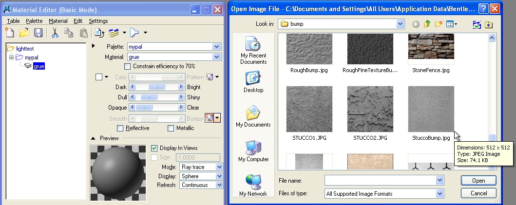 - Go to Palette>Open and and view a pre-defined palette of materials (note these are generally stored at C:\Documents and settings\All Users\Application Data\Bentley\Workspace\System\Materials.
