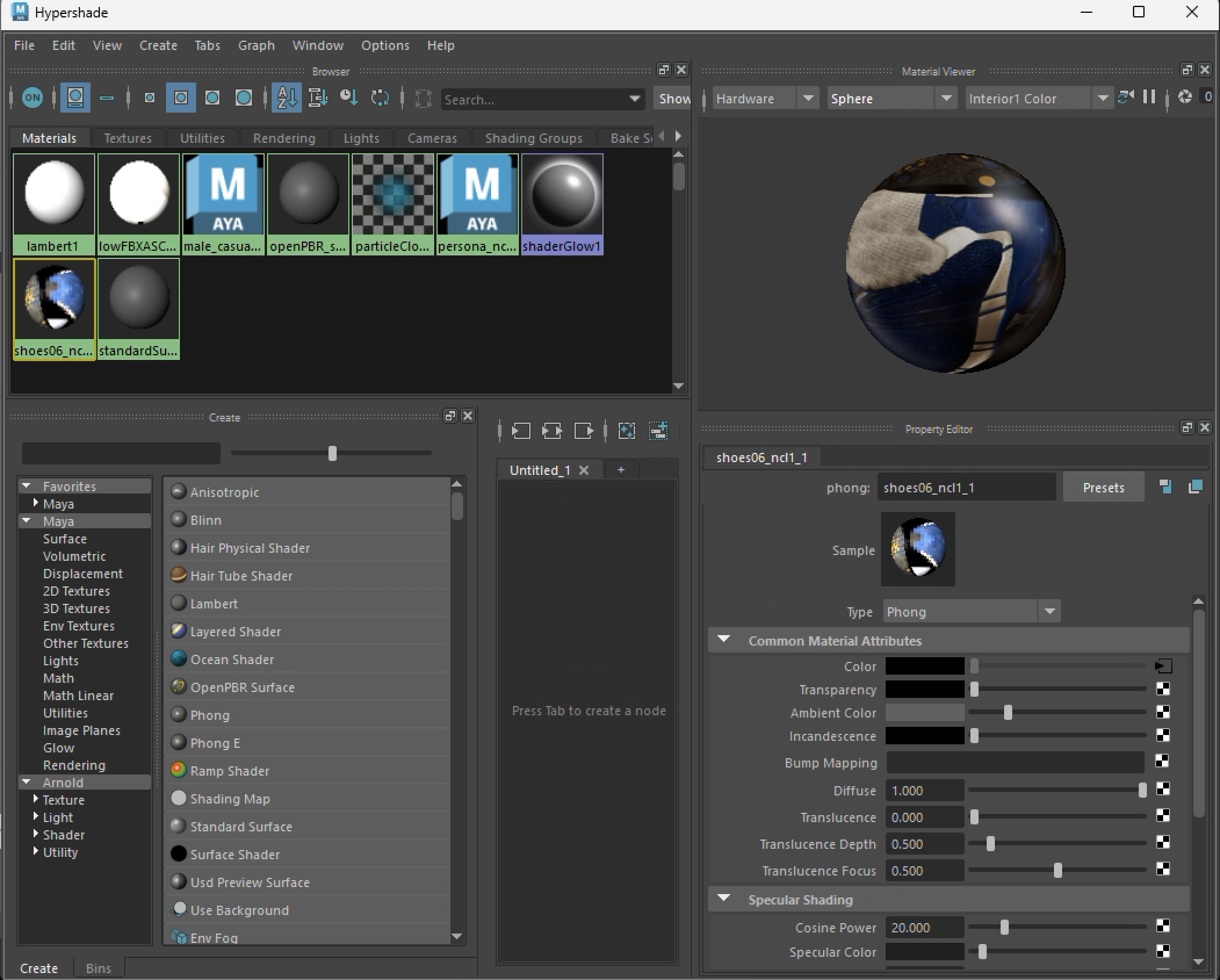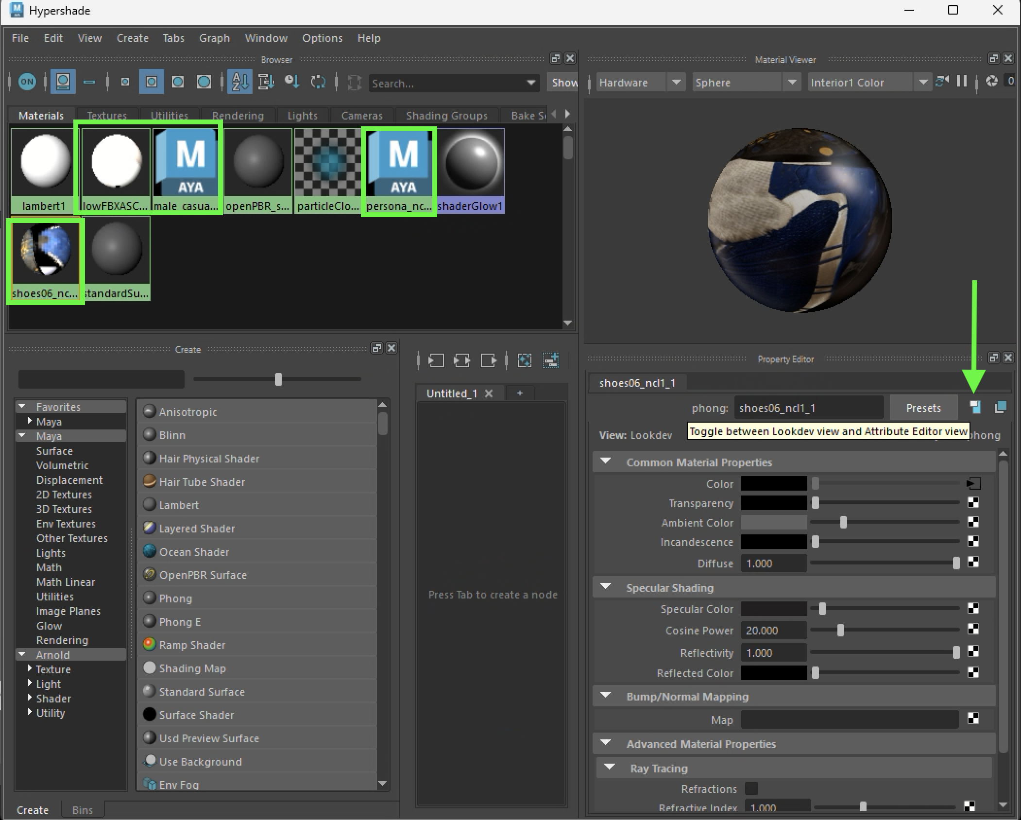 Figure 5: The Type “Phong” shader is now visible on the lower right hand side of the attribute editor.