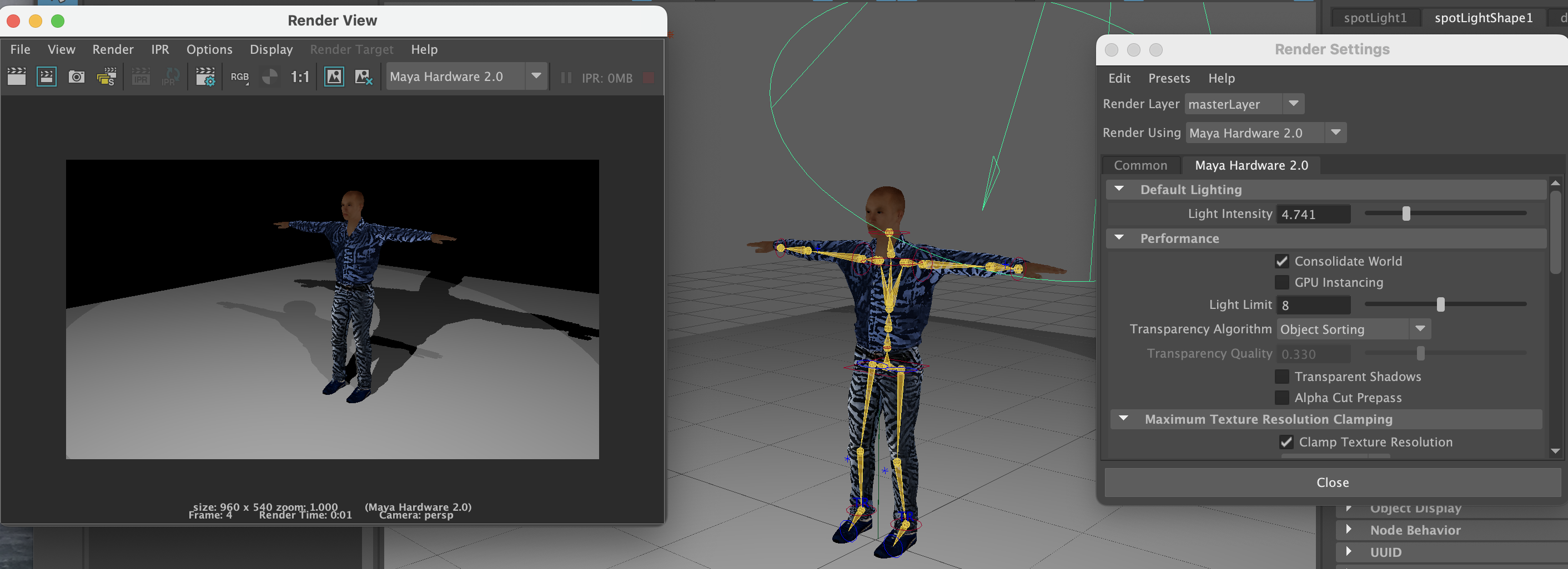 If you use Maya Software Rendering insred, be prepared to adjust lighting intensity to achieve similar effects. Some trial and error is expected. Figure 12 compares Maya Software (top) and Maya Hardware 2.0 (bottom) renderings with separately adjusted light levels.