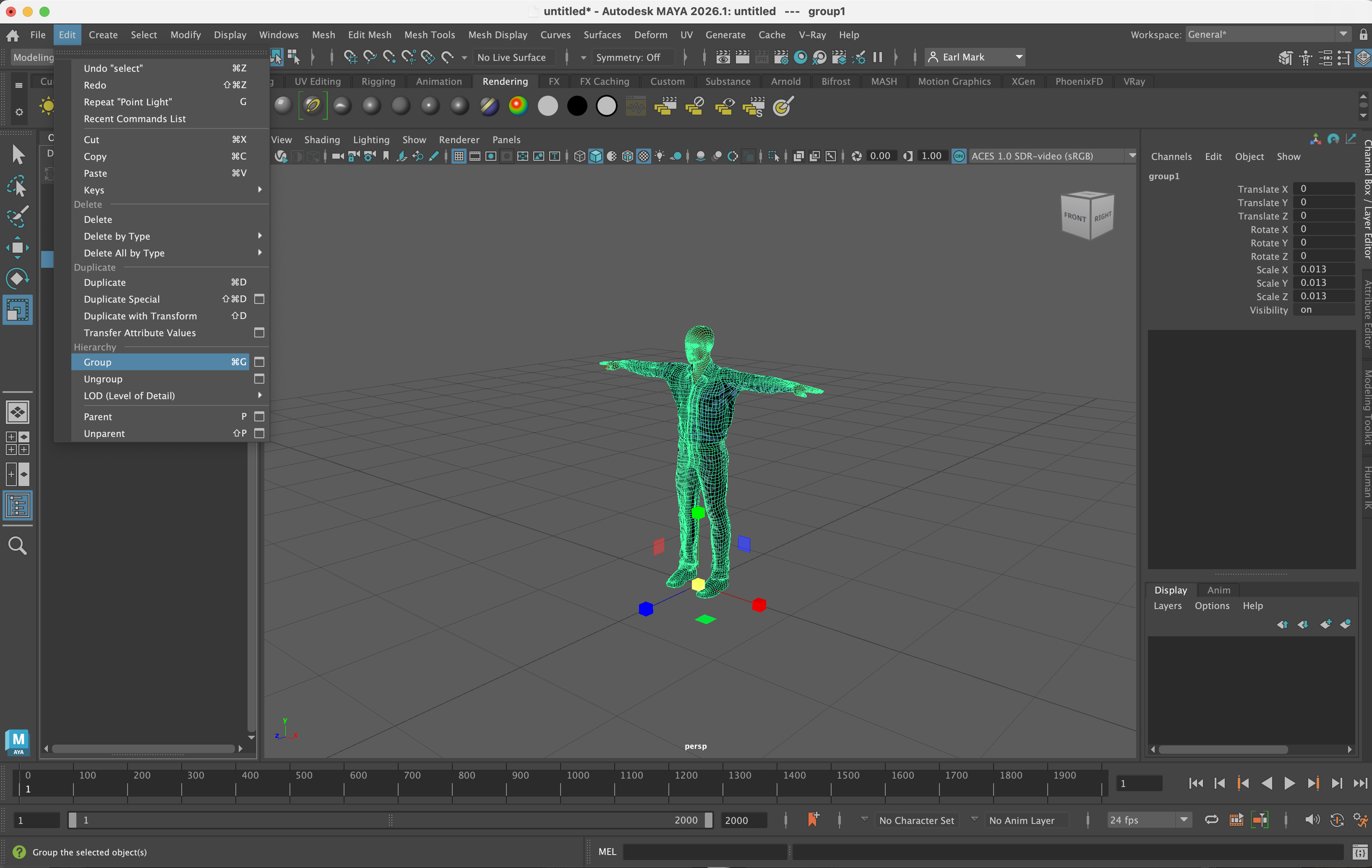 Figure 8. Use the “Edit/Group” menu to temporarily group the surfaces together first If you need to change the scale of the MakeHuman character. This will mean that both the geometry and the materials will scale appropriately.