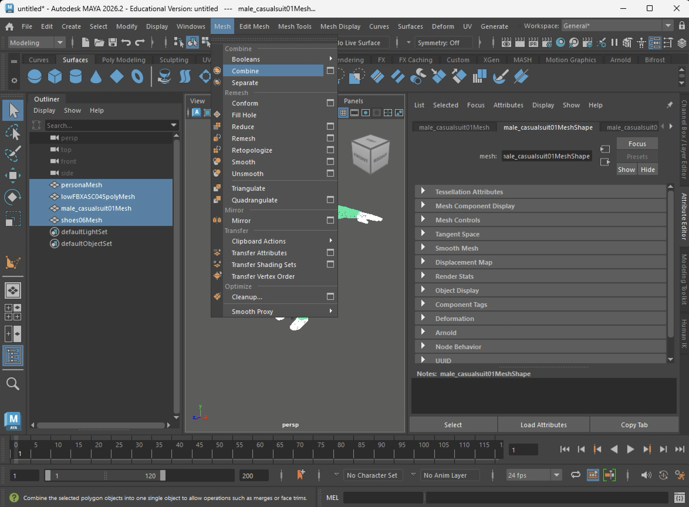 While it is common to combine them using Mesh > Combine (Figure 3), it’s better to adjust the materials first, before combining the meshes.