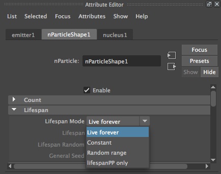 Lifespan mode under particle shape tab: (control in attribute dialog box)