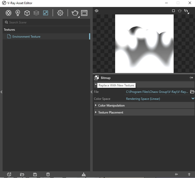5. Next, slelect the "Bitmap" icon on the right-hand side of the V-Ray Asset Editor and choose the "Replace with New Texture" option as shown in the screen capture below.