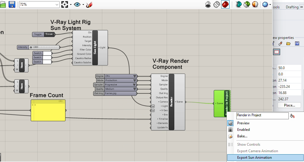 12. If the V-Ray Proxy tree in Rhino is referenced with a Geo component in Grasshopper, and the Geo component in turn is connected to V-Ray Proxy Mesh component in Grasshopper , then it can be incorporated in a time lapse sun study similar to workshop notes 14